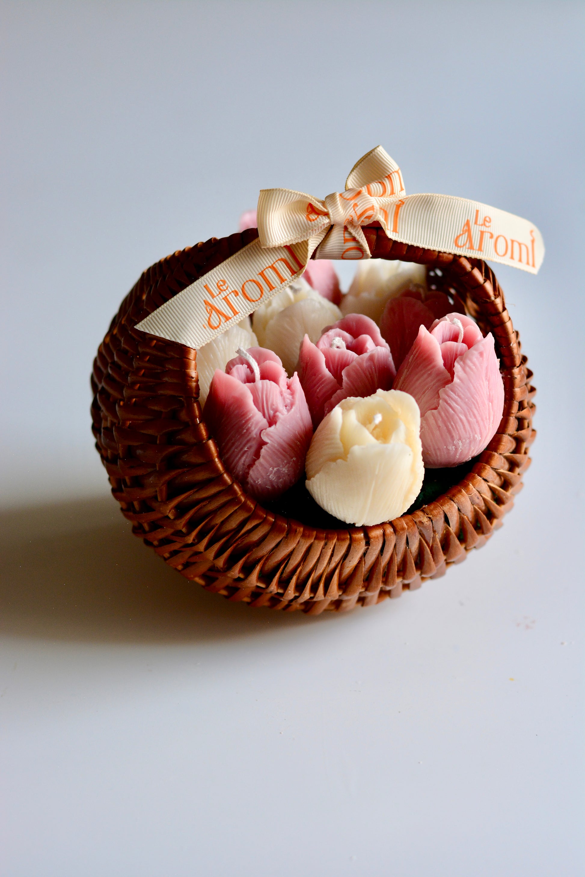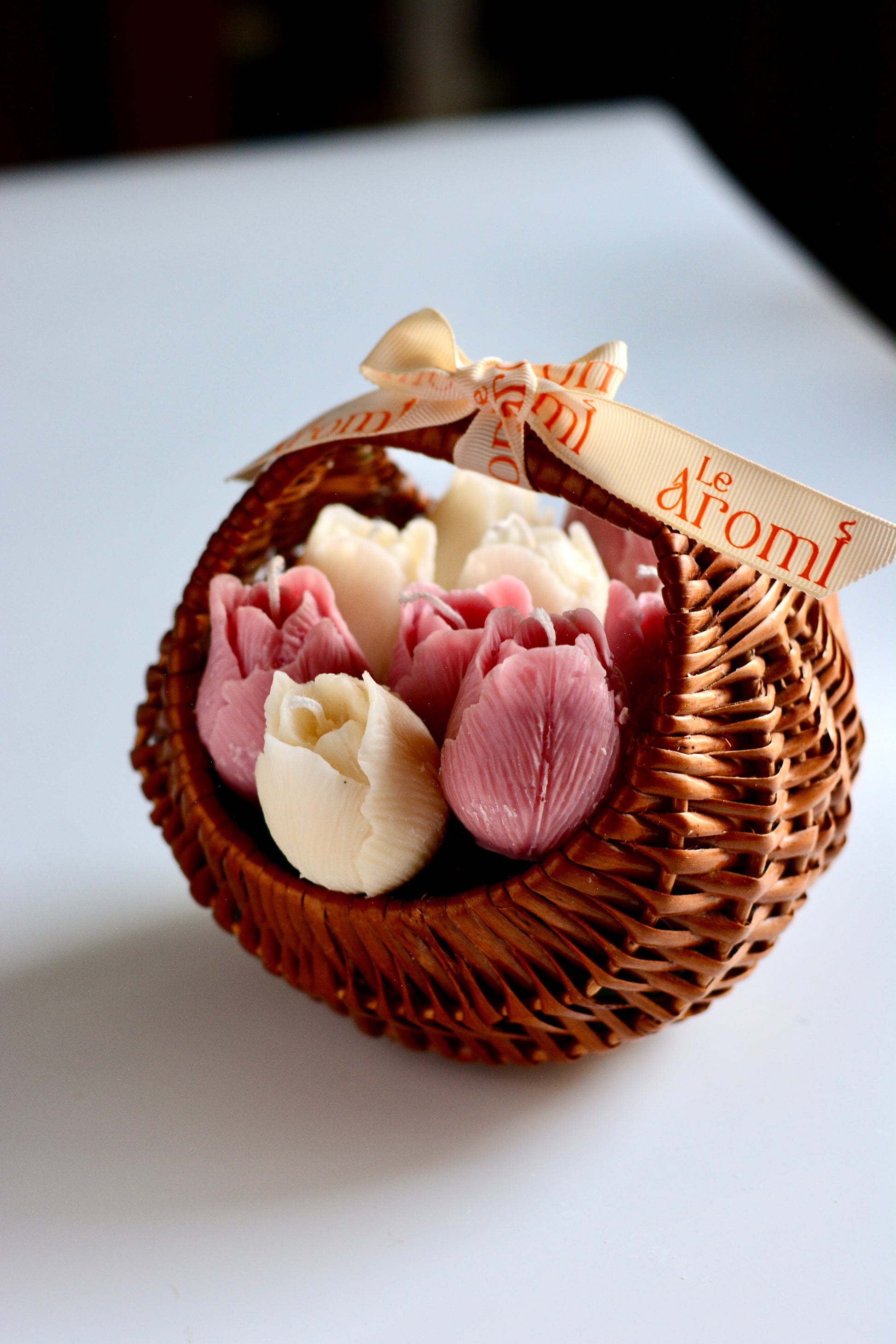 tulip bouquet candle, floral candle decor, handmade flower candle, cane basket candle, luxury soy wax candle, aesthetic candles India, decorative candles for gifting, Le Aromi candles, floral home decor candle, handcrafted candles